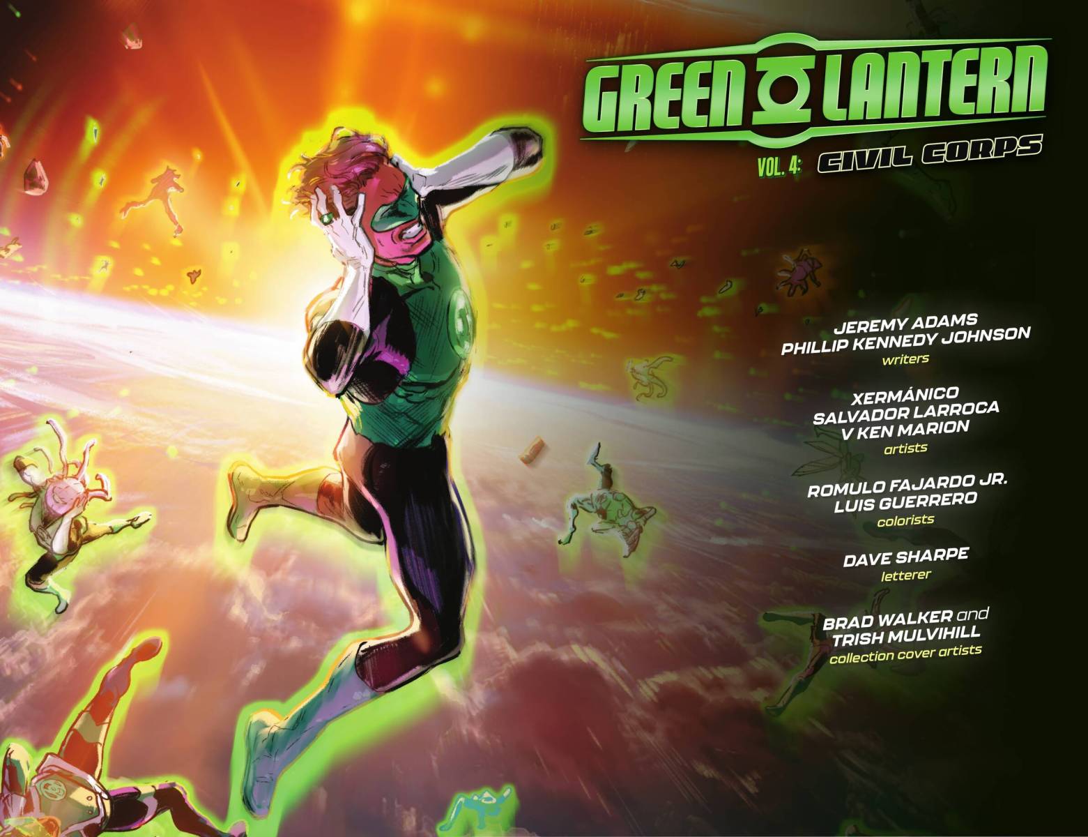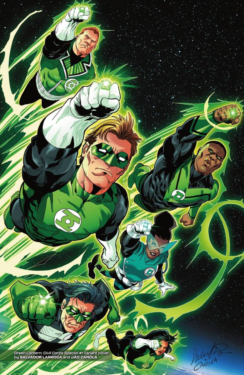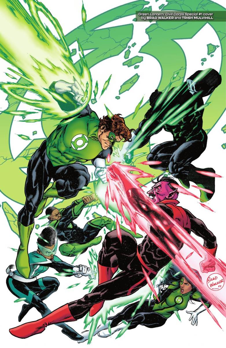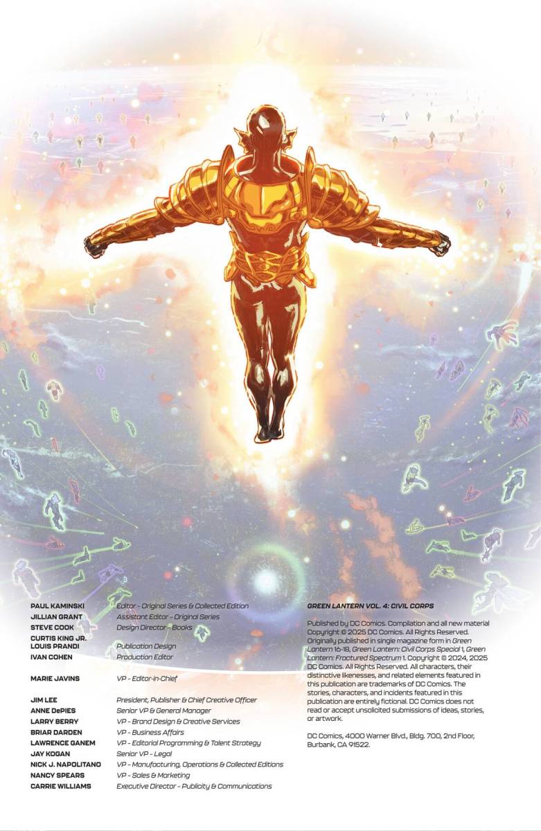 Green Lantern Vol. 4 – Civil Corps (TPB) (2025) : The Green Lantern Corps is at war…and the only hope for the heroes of Oa is to escape the control of the corrupt United Planets and survive the rise of the Fractal Lanterns! While Hal Jordan, John Stewart, and Guy Gardner fight for the survival of all sentient life in the universe, what will these conflicts mean for Kilowog, Mogo, and Kyle Rayner? Collects Green Lantern #16-18, Green Lantern: Civil Corps Special #1, and Green Lantern: Fractured Spectrum Special #1.