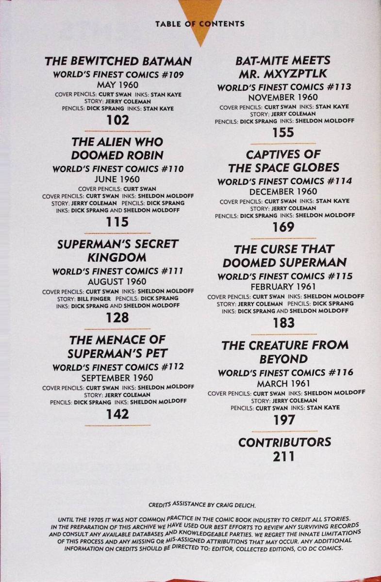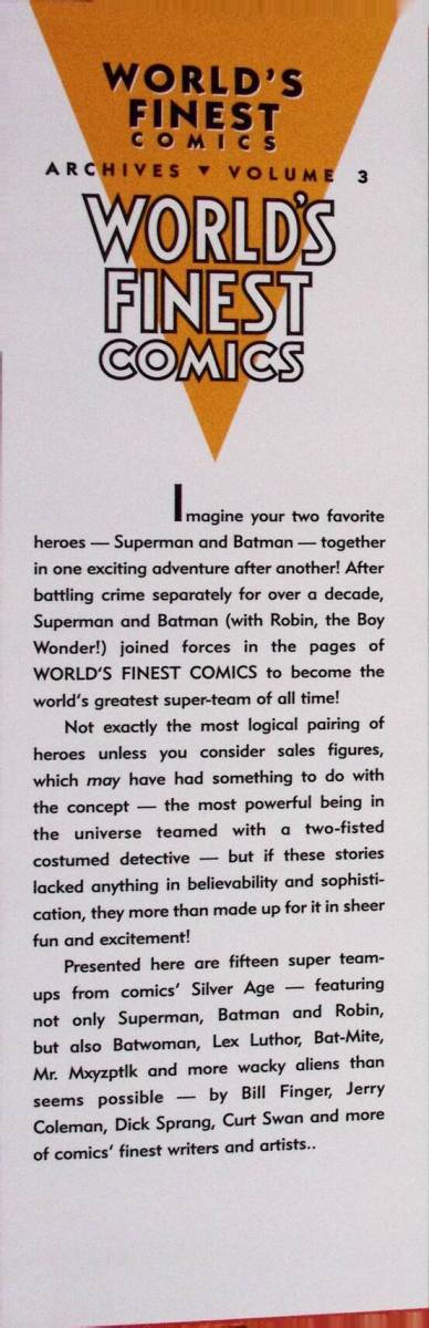 World’s Finest Comics Archives Vol. 3 (2005) : DC Comics proudly presents classic Silver Age material from WORLD’S FINEST #102-116 by two of the artists most associated with Batman and Superman! Guest stars include Batwoman and Lex Luthor, plus Mr. Mxyzptlk and Bat-Mite team up!