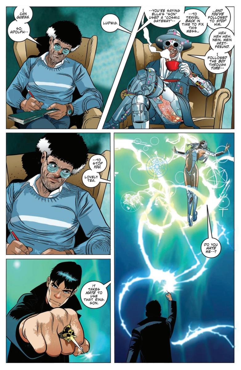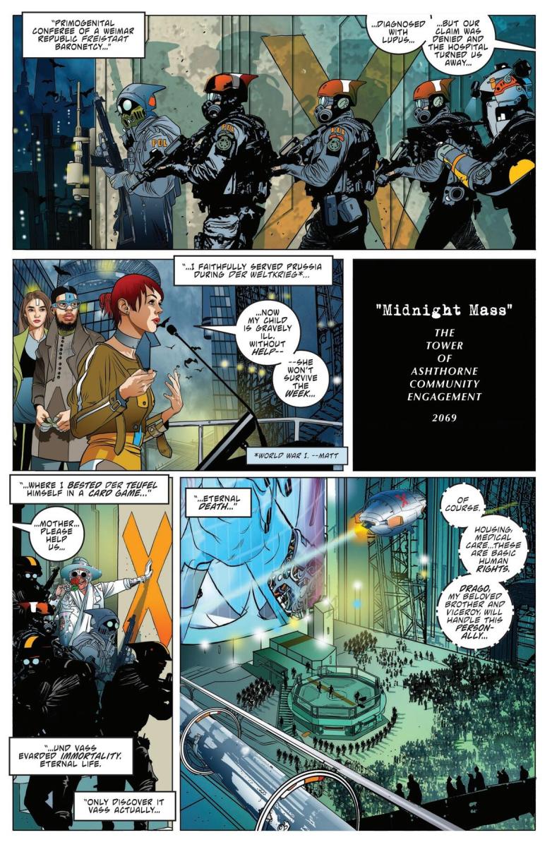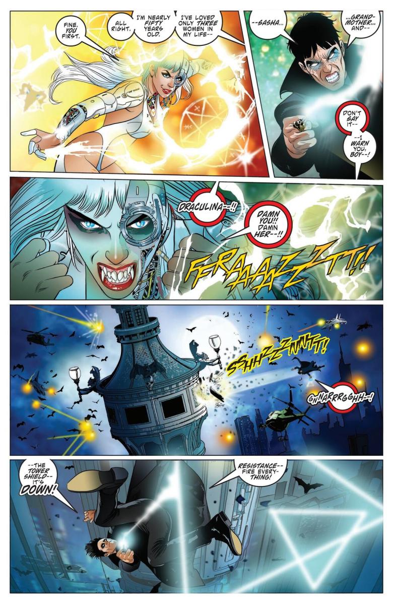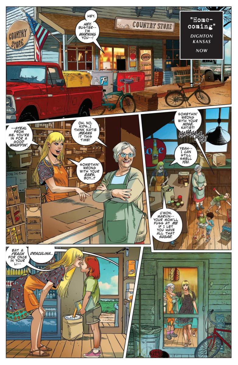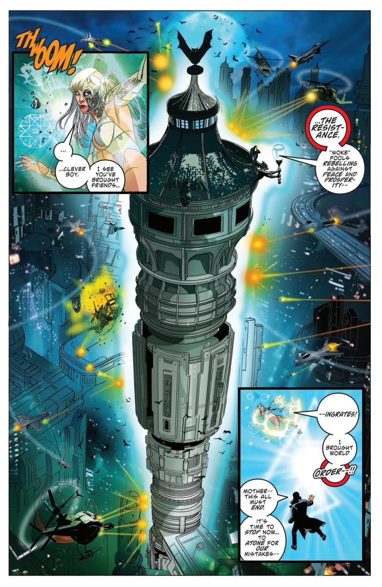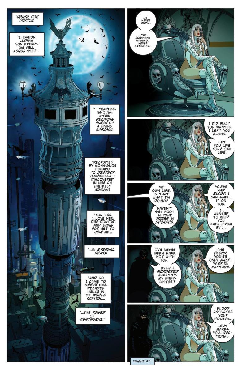 Vampirella #5 (2025) : In an all-too-possible future following a global apocalypse, a vengeful Vampirella seizes power and imposes a crushing totalitarian order over the entire Earth — leaving her son Cicero with no other choice but to turn to evil to stop her. Meanwhile, in the foreboding present, a cyberpunk Baron Von Kreist arrives from the future, hell-bent on preventing Cicero from disrupting the coming dark future — by any means necessary!