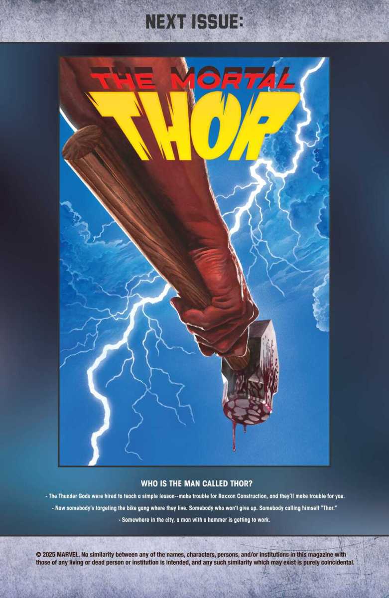 The Mortal Thor #1 (2025) : The legend begins! The Norse Myths tell of Gods who walked the Earth, doing great deeds for the mortals who believed in them. But Asgard isn’t real, and never was. The Gods never soared in our skies, never stood with our heroes, never fought for kindness or justice. It was all just a story. Nobody’s coming to help us. But somewhere in the city… a man is waking up. A man with a hammer.