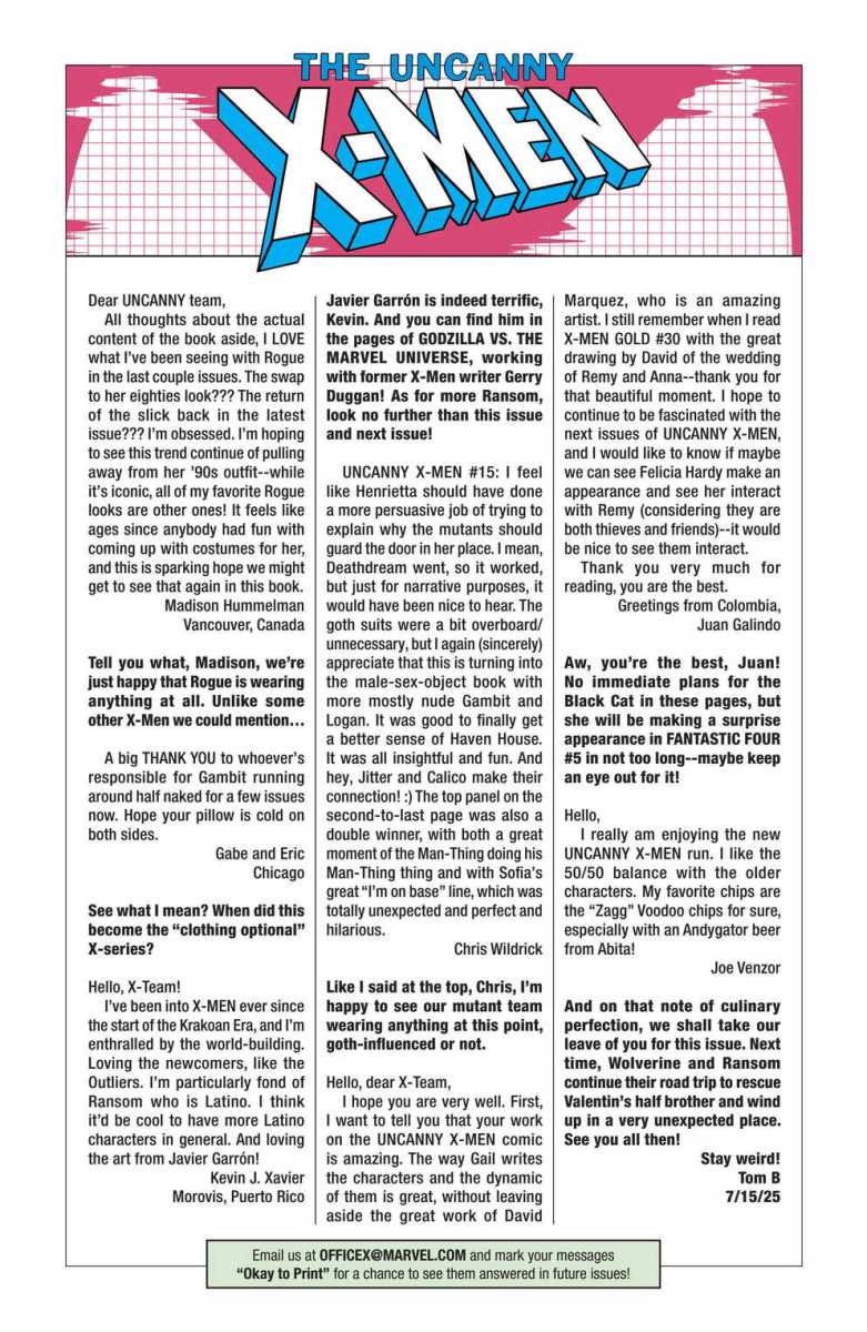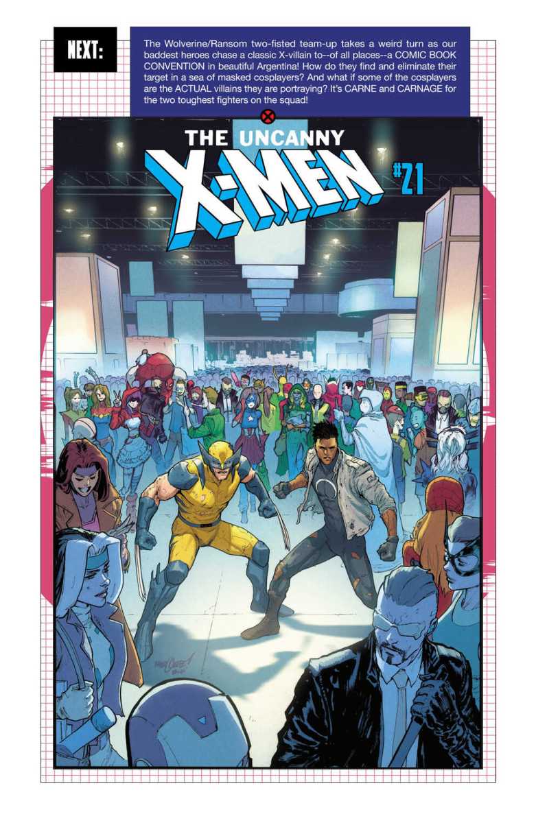 Uncanny X-Men #20 (2025) : The two baddest brawlers of the Louisiana X-Men buddy up to go undercover in faraway Argentina… to chase and destroy a legendary X-villain! Two-fisted fury as only WOLVERINE and RANSOM can bring it, and it’s a rough, roaring ride for anyone who gets in their way!
