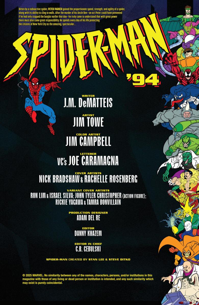 Spider-Man ’94 #1 (2025) : After searching to the ends of the Multiverse, PETER PARKER — the AMAZING, the SPECTACULAR, the RADIOACTIVE Web-Head himself — A.K.A. SPIDER-MAN, swings back into the streets of New York City with his beloved Mary Jane WATSON in tow! But what’s this? One of these villains is not like the others: Witness this universe’s debut of not one, but TWO of Spider-Man’s greatest villains from the comics! Legendary Spider-Scribe J.M. DeMATTEIS and rising star artist JIM TOWE bring you the return you’ve all been waiting thirty years for! And you’re never going to expect the twists and turns ahead for your friendly neighborhood Spider-Man! Break out your action figures, and post up in front of the TV as we bring you back to the greatest era of animated super-hero television in history!