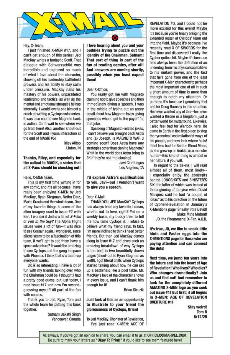 X-Men #22 (2025) : THE LEAD-IN TO NEXT MONTH’S GAME-CHANGING EVENT! With Z*E*R*O on his heels, Doug Ramsey, A.K.A. REVELATION, arrives in Alaska for the X-Men’s help! Beset on all sides, the X-Men could use a powerful new ally — but Revelation is not just an old friend, he’s the Heir of Apocalypse! And what new age could such an alliance usher in…?