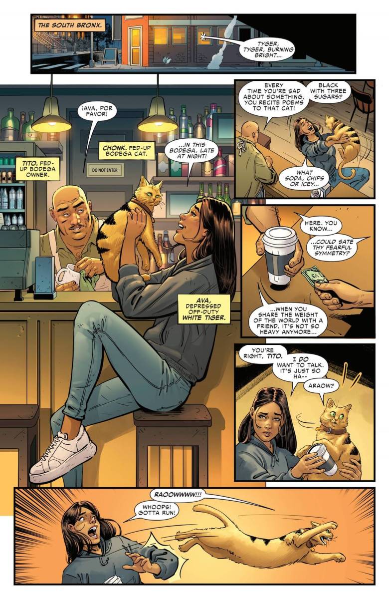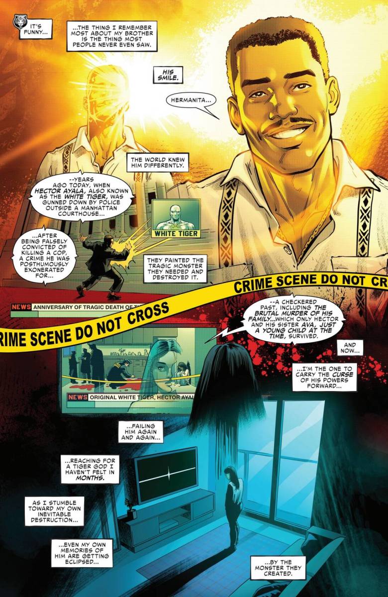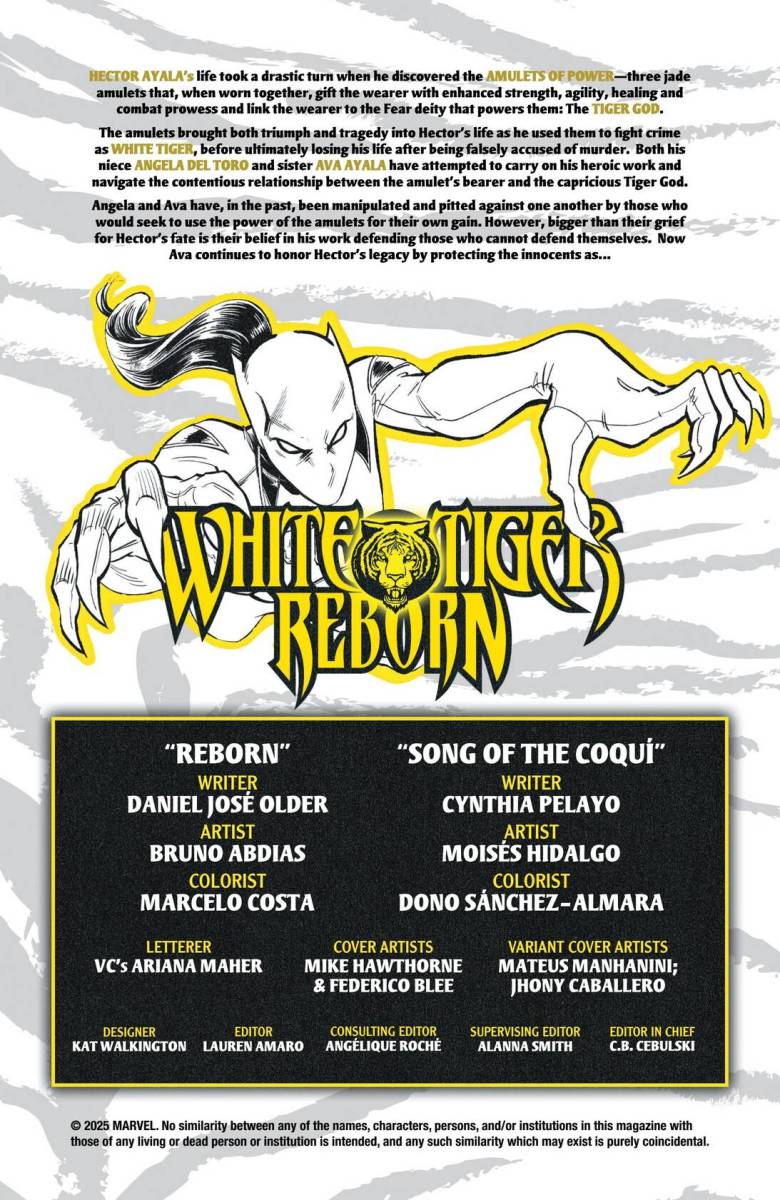 White Tiger – Reborn #1 (2025) : Ava Ayala is the current wielder of the powers of the White Tiger, bearing the amulet of power that imbue its host with a connection to mystical power and martial arts prowess. As Ava returns to her old stomping grounds to protect the innocent, she becomes embroiled in a mystery that forces her to confront her family’s murder and convoluted history linking them to the White Tiger mantle as Ava is brought face-to- face with — Hector Ayala, her dead brother and the original White Tiger?! In this special, celebrating Hispanic and Latin America Heritage Month, superstar writer Daniel José Older uncovers never-before-seen moments of the White Tiger’s history and propels Ava into a new era as she reforges her link to the Tiger God and makes the mantle her own in this gripping tale! Plus, don’t miss out the Marvel debut of Bram Stroker award winner, Cynthia Pelayo, in this action-packed special celebrating the legacy of American Comic’s first Latin Hero!