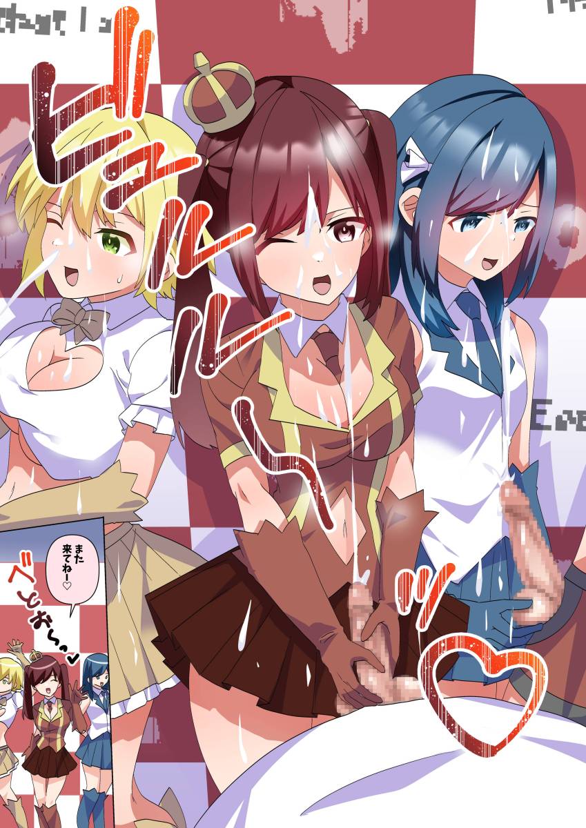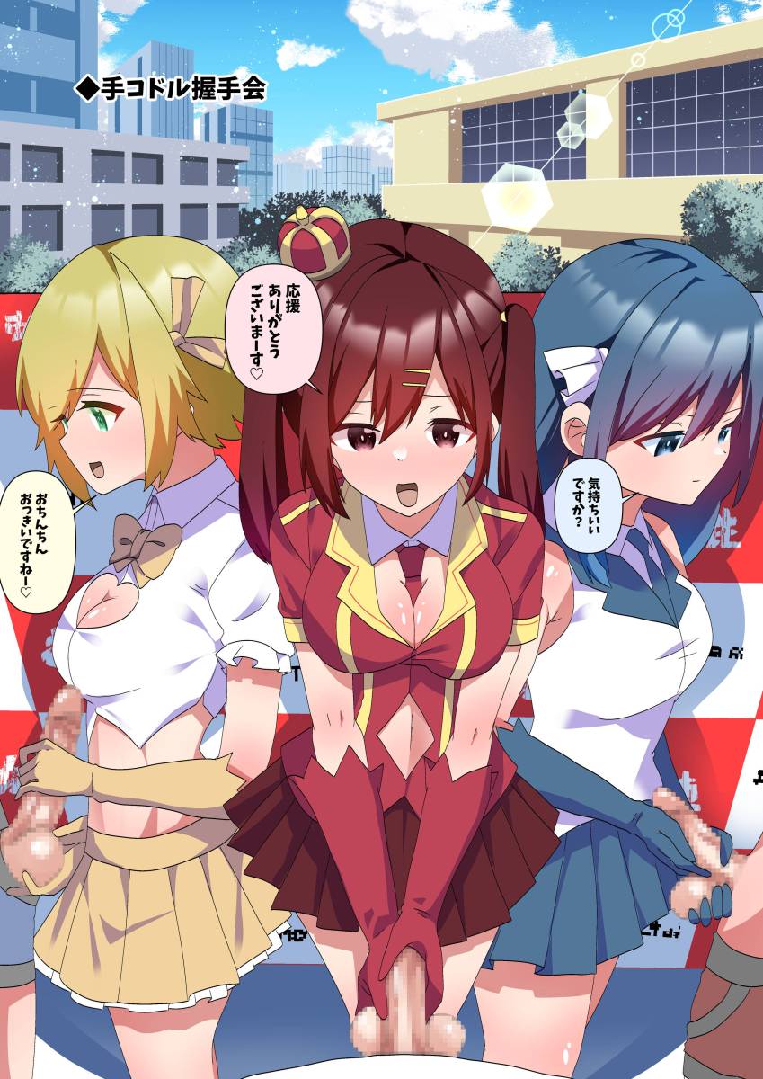 握手会で手コキをしてくれるアイドル。ためてきた精子をきわどい衣装に向けて放出しよう。