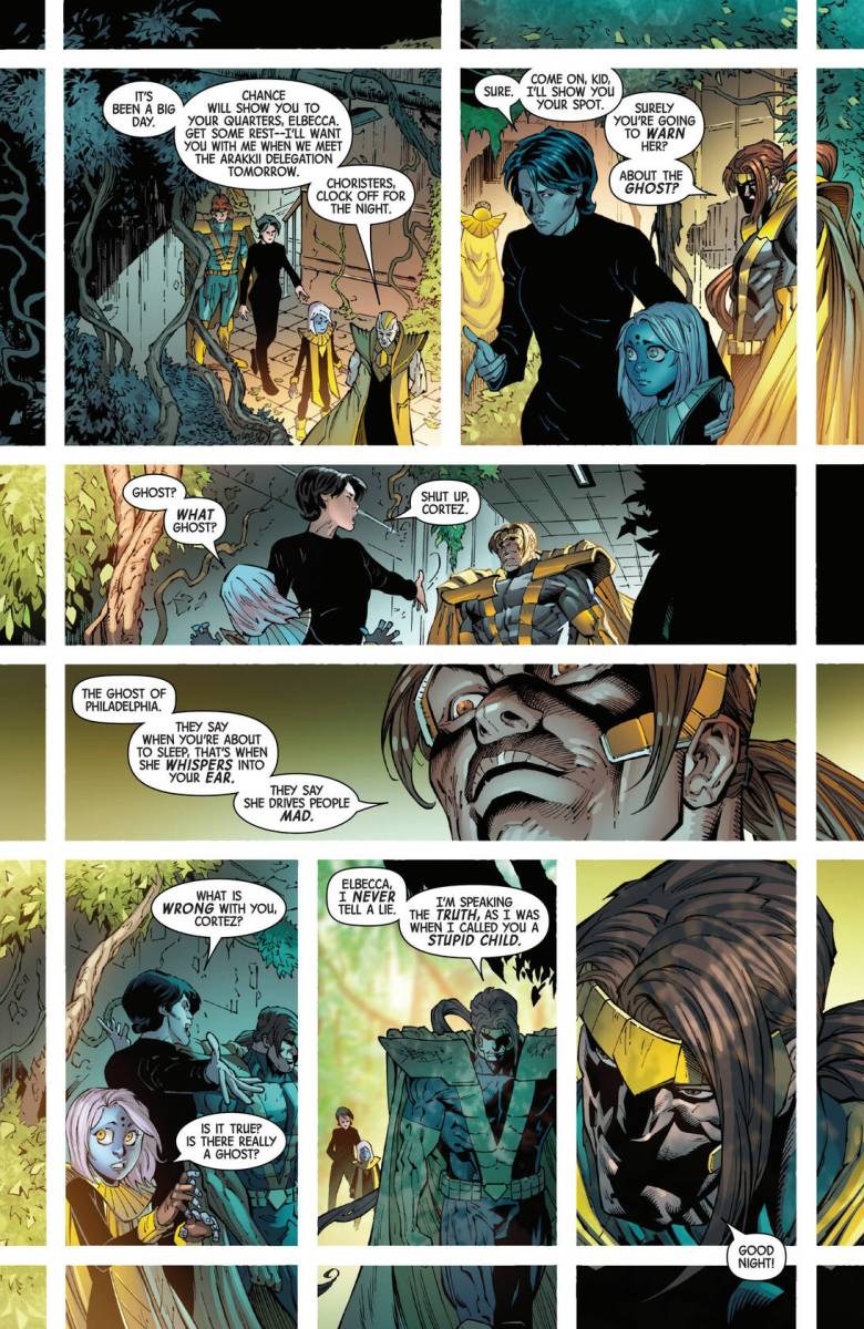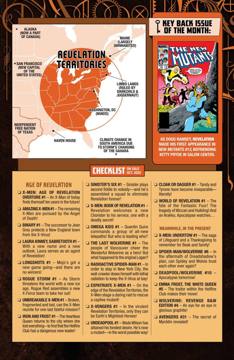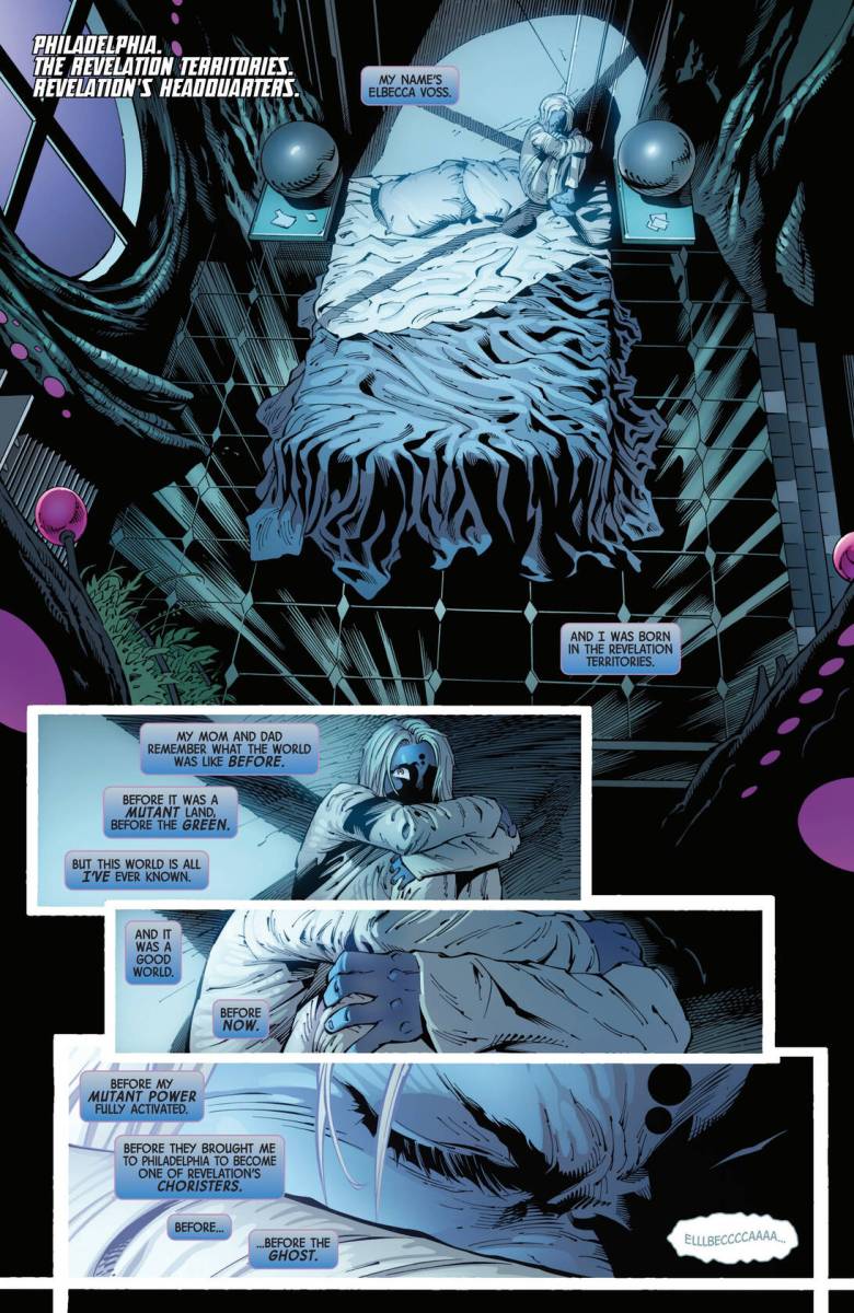 X-Men – Book of Revelation #1 (2025) : THE GAME OF POWER COMMENCES! X YEARS LATER, after the assassination of one of his prized Choristers, Revelation welcomes a new mutant to his capital city of Philadelphia. But the capital of the Revelation Territories hides many dangers, not the least of which are her rival Choristers — and Fabian Cortez will allow no one to challenge him for Revelation’s favor. But this new mutant has a secret ally – the Ghost of Philadelphia!