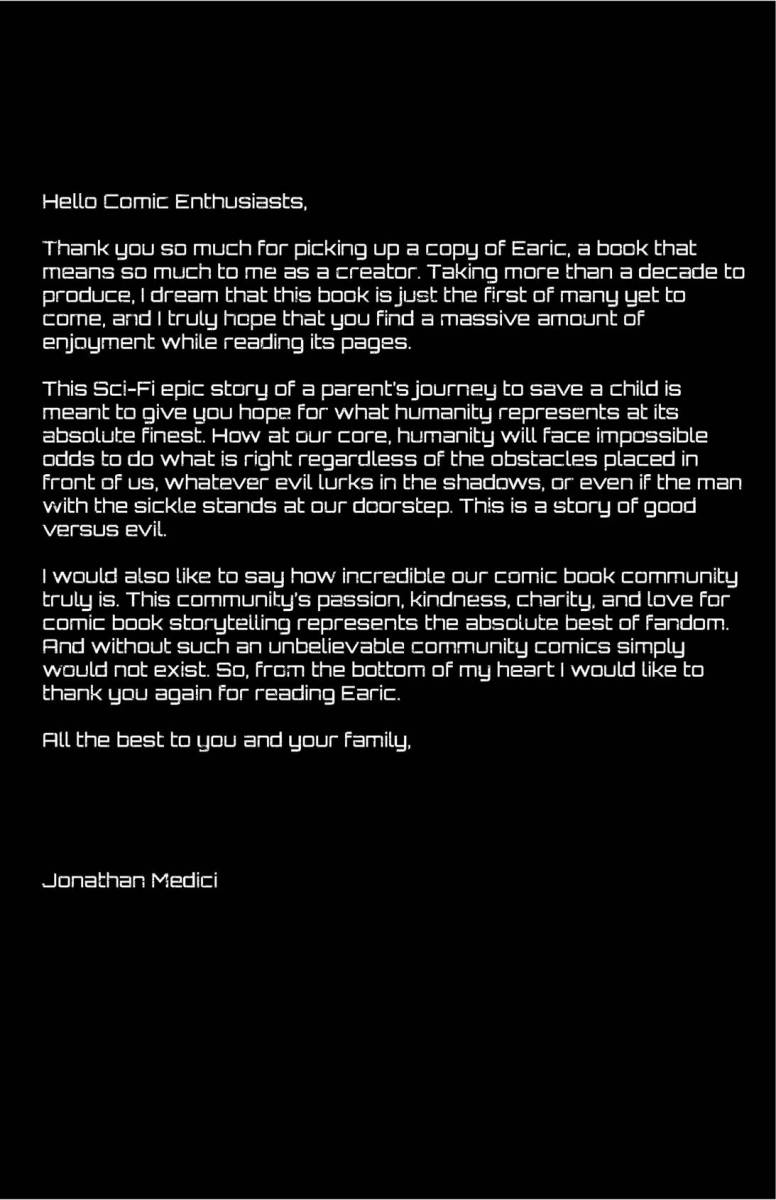 Avalon Vol. 1 – Earic (2025) : Set in the near future, this Sci-Fi graphic novel is about the journey a father must take to save his son, the first sick child in nearly a century, while navigating a violent war between two divergent groups of human beings, charges of treason, and certain death.