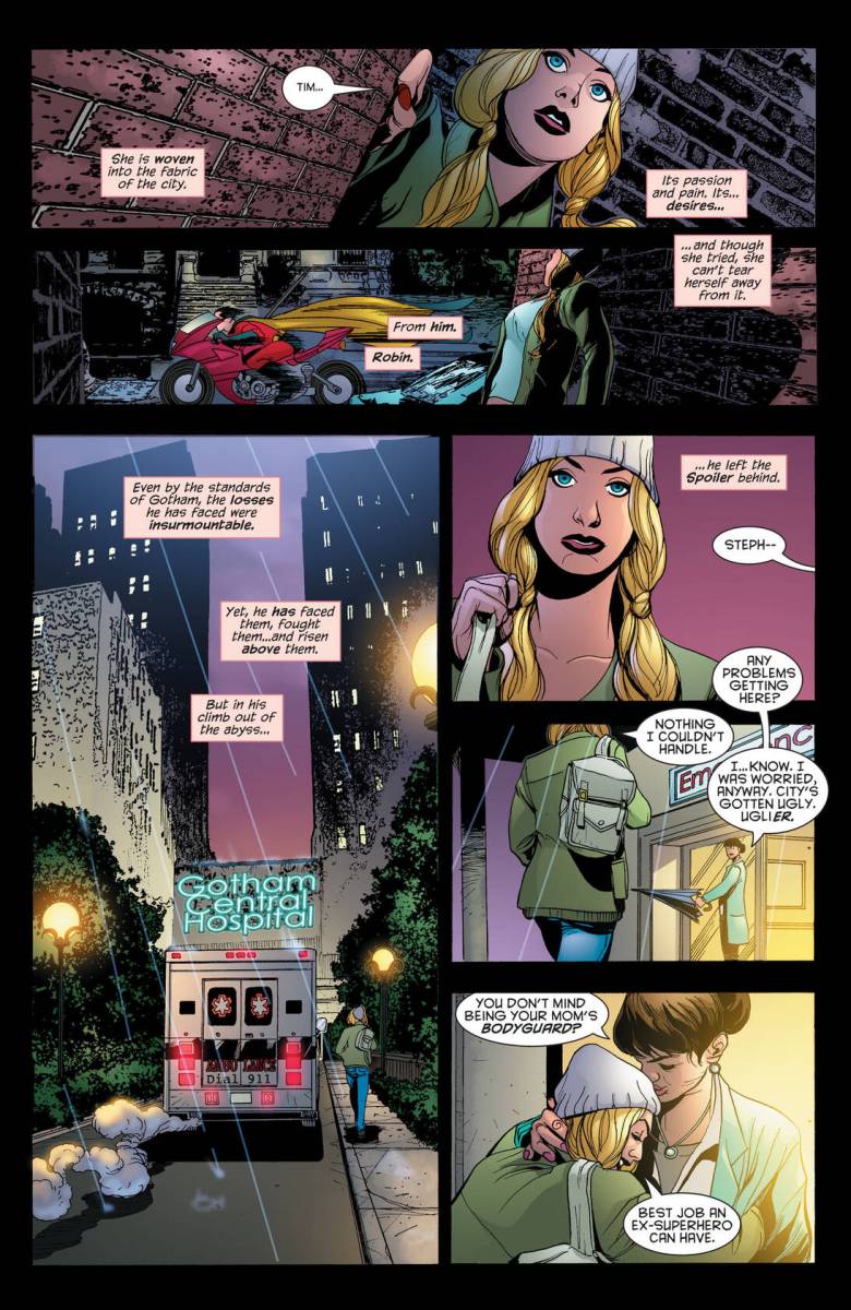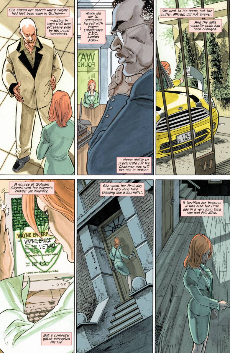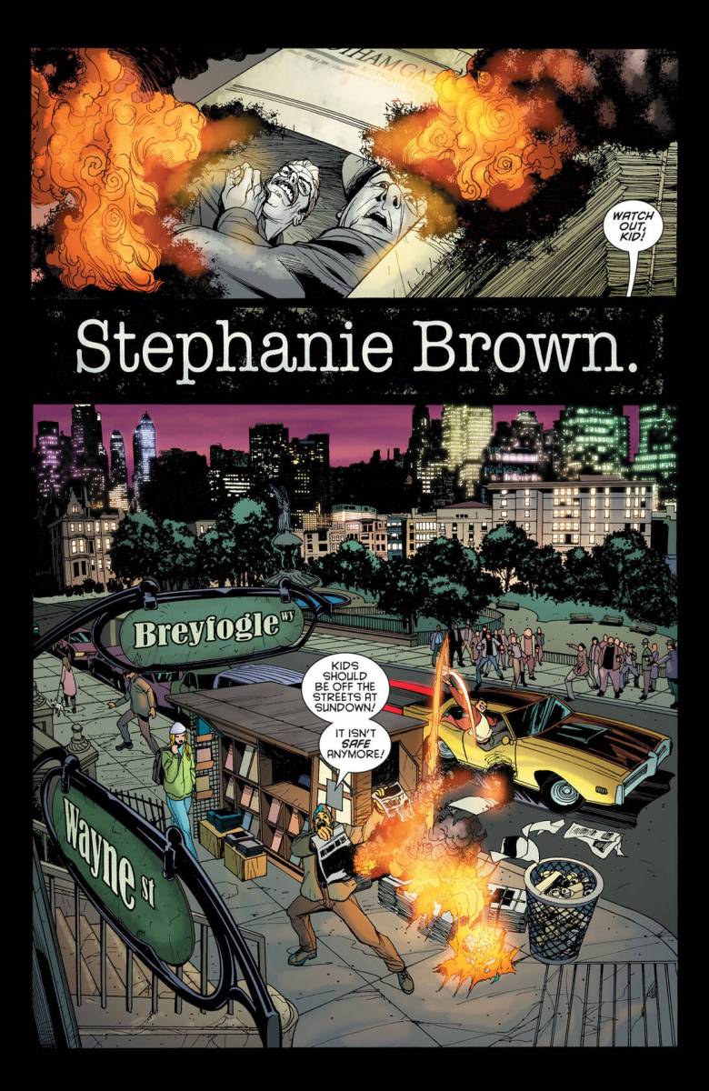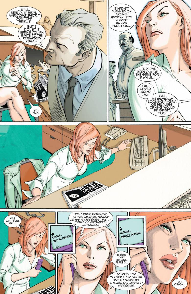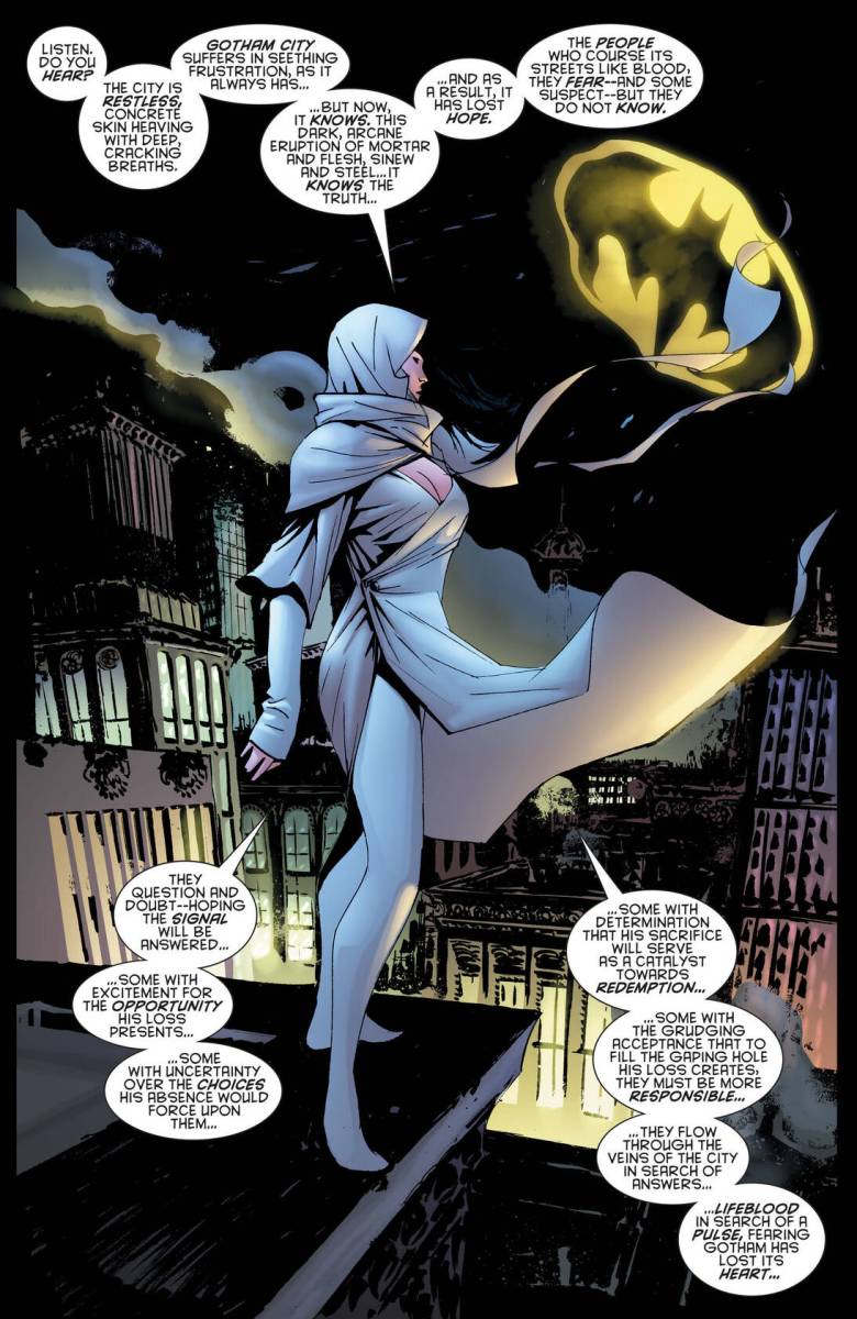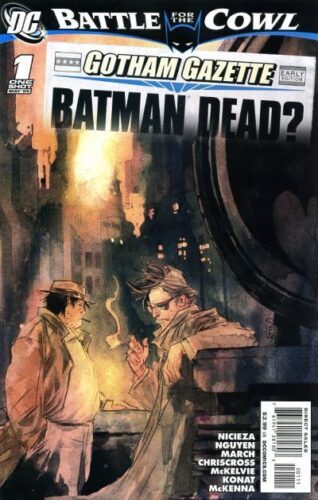 Gotham Gazette – Batman Dead #1 (2009) : A city looking to kill itself. A population without its dark avenger, without answers, without hope. A cop looking to save Gotham from its own madness. A reporter looking to reclaim her career by revealing that it’s no coincidence the city’s top billionaire and its urban legend are missing at the same time. A doctor seeking to regain her soul by stepping back into Hell. One hero who can’t quite get it right no matter how hard she tries. Harvey Bullock. Vicki Vale. Dr. Leslie Thompkins. Stephanie Brown. What do all these people have in common? Without Batman, Gotham City continues to fall apart, and these extraordinary ‘ordinary’ people try to mend the city’s wounds, looking into a dark night for answers.