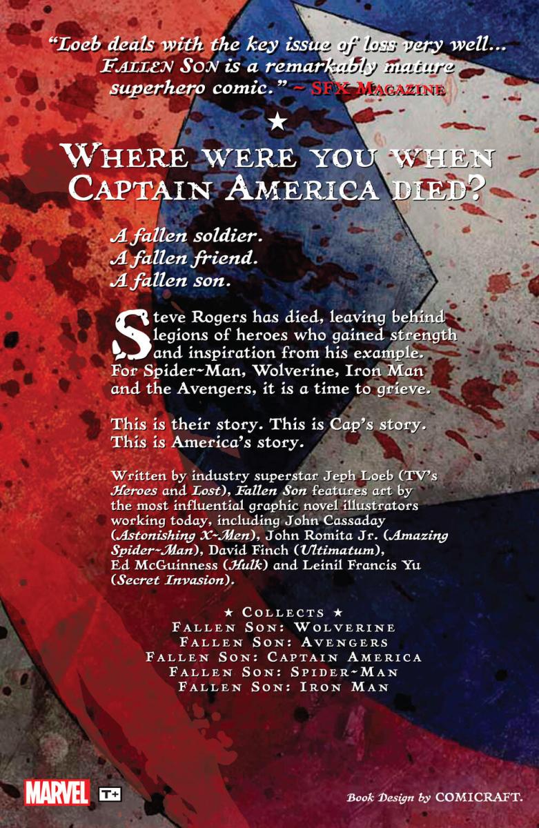 Fallen Son – The Death of Captain America (TPB) (2008) : Where were you when Captain America died? Follow the reaction of the legendary heroes’ best friends and closest comrades as they struggle to work through the emotions stirred by the loss of their ally, and the stages of grief that make them confront the part they may have played in that loss: Wolverine. The Avengers. Hawkeye. Spider-Man. Iron Man. Collects Fallen Son: Death of Captain America – Wolverine, Avengers, Captain America, Spider-Man, Iron Man.